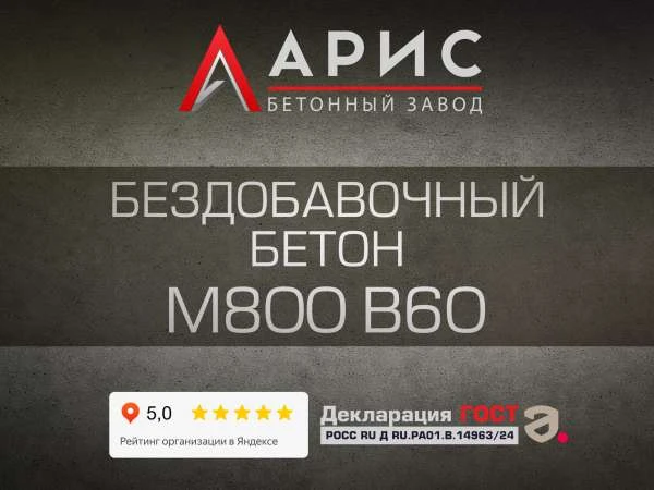 Бездобавочный бетон М800 В60 F400 W18 (гравий) от завода «Арис» – высокая марка с предсказуемой технологией и поставкой по графику.